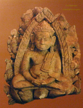 พระพิมพ์ประทับนั่งปางประธานธรรมในซุ้มพุทธคยา พบที่พงตึก จัดแสดงที่พิพิธภัณฑสถานแห่งชาติราชบุรี