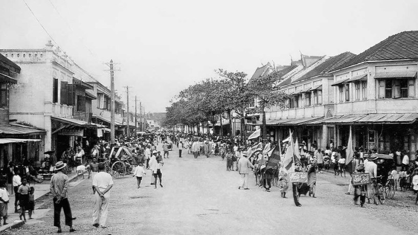 ภาพบน ตึกแถวที่ถนนเจริญกรุงเมื่อครั้งแรกสร้าง มองไปเห็นประตูสามยอดด้านไกลๆ