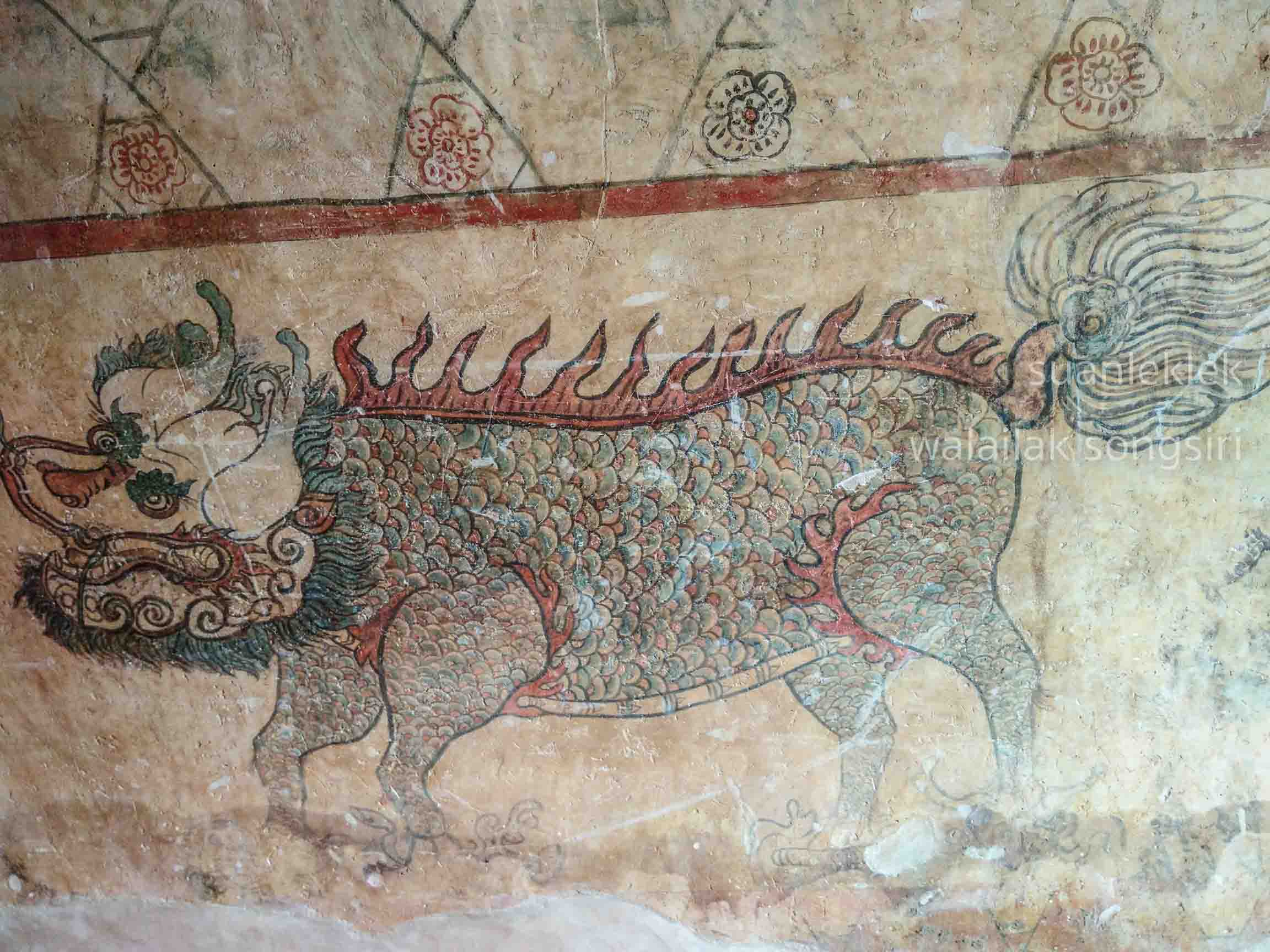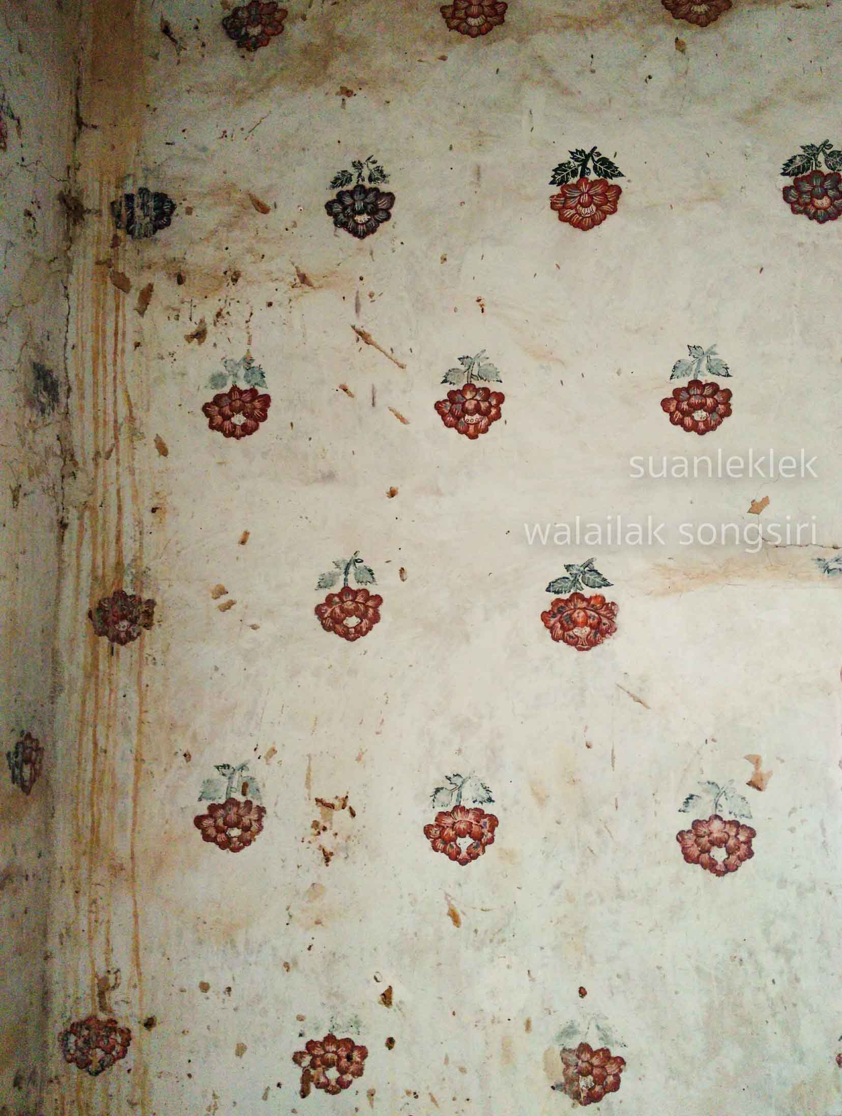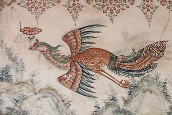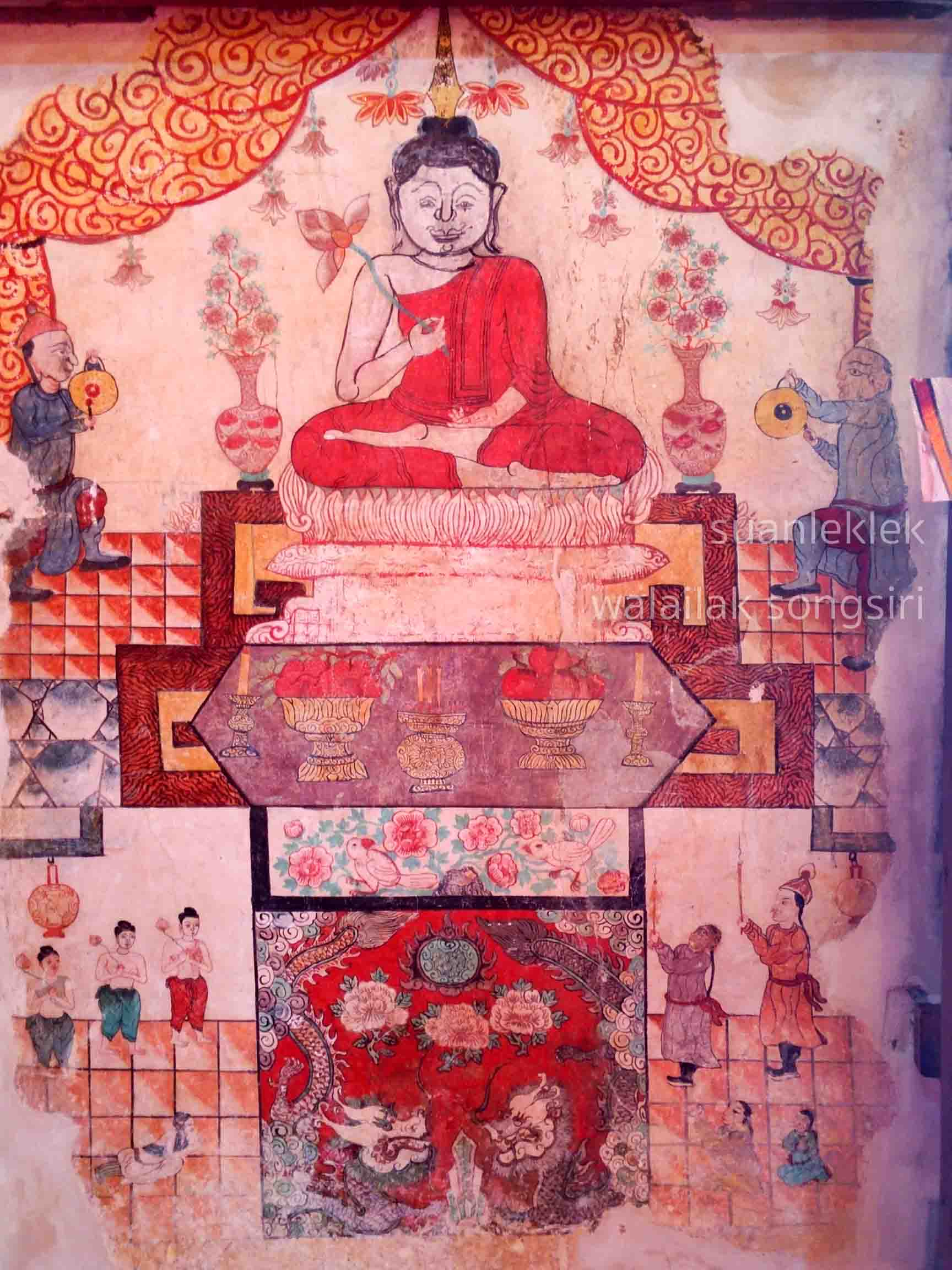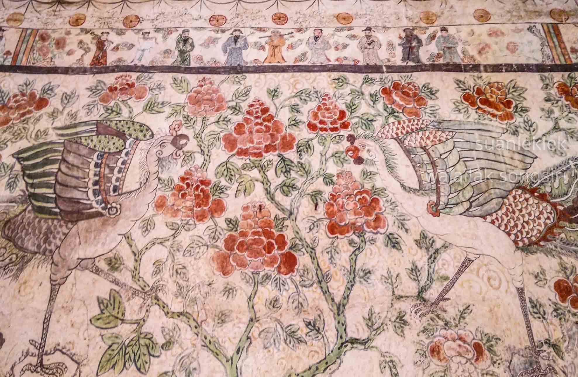 จิตรกรรมฝาผนังรูปเซียน ด้านบนเป็นรูปดอกไม้ในกรอบรูปเหลี่ยม บ้างมีรูปนกประกอบที่ประดับเต็มทุกผนัง และลายดอกไม้ร่วงที่มณฑปประดิษฐานพระนอน ภาพหงส์บินใต้รูปแปดเซียน ภาพกิเลน ซึ่งลวดลายประดับทั้งหมดนี้ล้วนเป็นลวดลายสิ่งมงคลตามความเชื่อในคติจีน