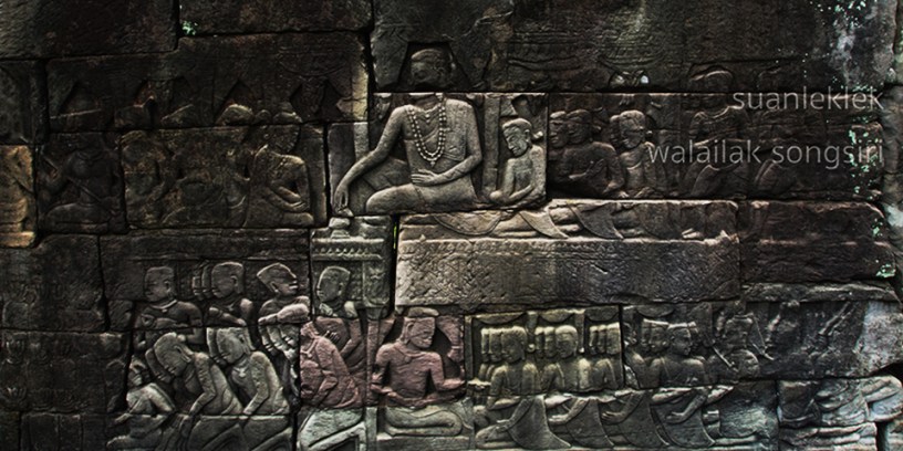 ภาพสลักนูนต่ำเล่าเรื่องพิธีพุทธาภิเษกโดยพระเจ้าชัยวรมันที่ ๗ ที่ปราสาทบันทายฉมาร์
