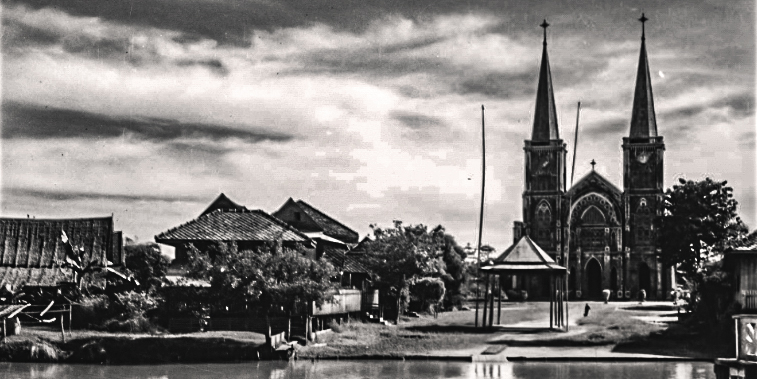 ชุมชนชาวอันนัมหรือชาวญวนและโบสถ์แคธอลิค แม่น้ำจันทบูร พ.ศ. ๒๔๗๘ ภาพถ่ายของ. Pendleton, Robert Larimore, 1890-1957 จาก http://collections.lib.uwm.edu/digital/collection/agsphoto/id/16099/rec/3