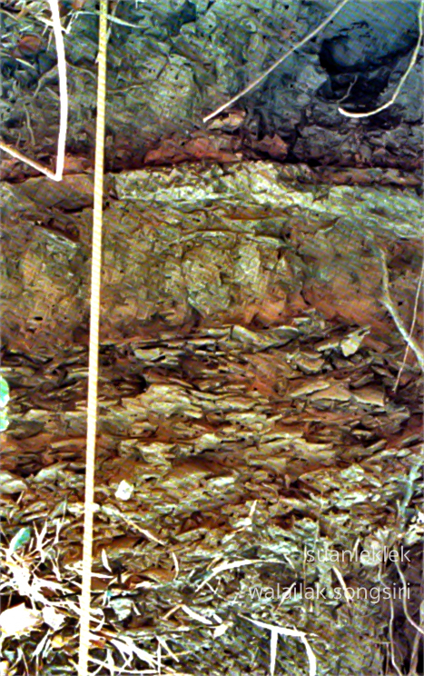 ชั้นดินส่วนหนึ่งที่โพนส้มโฮง บ้านท่าเรือ ตำบลท่าเรือ อำเภอนาหว้า จังหวัดนครพนม มีร่องรอยของชั้นดินเผาไฟและชั้นทับถมของเศษภาชนะดินเผา