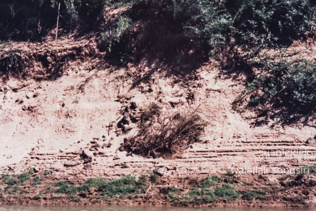 พบร่องรอยของกลุ่มเตาเรียงรายอยู่ตามริมตลิ่งจำนวน ๒๘ เตา เป็นเตาทรงประทุนที่ขุดลึกเข้าไปในตลิ่ง และถูกน้ำกัดเซาะจนพังทลาย แต่ยังคงมีร่องรอยลักษณะของเตาอย่างชัดเจน พบว่า มีก้อนศิลาแลงรูปสี่เหลี่ยมวางตั้ง ๒ ข้างของปากเตาคล้ายเป็นช่องใส่ไฟและกันความร้อน พื้นเอียงลาดขึ้นเล็กน้อย ผนังส่วนบนของเตาถูกน้ำกัดเซาะจนปรากฏรูปทรงเตาเป็นรูปกลม ทำให้ไม่แน่ใจว่าเรื่องรูปทรงของเตาในแต่ละแห่งจะมีความแตกต่างกันอย่างไรบ้าง บริเวณชายตลิ่ง บริเวณนี้ถูกน้ำกัดเซาะจนมีลักษณะชันหน้าตัด ไม่มีชายหาด ชาวบ้านกล่าวว่า กลุ่มเตาเหล่านี้เพิ่งมีการสังเกตุเห็นเมื่อไม่กี่ปีมานี้ หลังจากน้ำพัดเอาดินชายตลิ่งหายไปเรื่อย ๆ กลุ่มเตาจึงปรากฏขึ้น