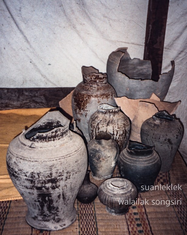 เศษภาชนะที่พบเป็นจำพวก ภาชนะเนื้อแกร่งสีเทาไม่เคลือบและเคลือบสีน้ำตาล รวมถึงภาชนะเนื้อดิน
