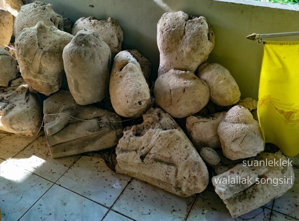เมื่อสำรวจบริเวณวัดร้างที่ “วัดเจดีย์หัก” พบว่าบางแห่งมีสภาพค่อนข้างทรุดโทรม ที่วัดเจดีย์หักมีการสร้างอาคารคลุมเป็นศาลาย่อมๆ โบราณวัตถุที่พบระบุได้จากรูปแบบ เช่น ใบเสมาทำจากหินทราย เป็นใบเสมาที่นิยมสร้างในสมัยอยุธยา ชิ้นส่วนพระพุทธรูปทำจากหินทรายแดงและชิ้นส่วนของพระพุทธรูปปูนปั้น อิฐจากโบราณสถาน ส่วนหนึ่งในพังลงไปแม่น้ำเจ้าพระยาไป และมีต้นไม้ขึ้นปกคลุมโดยมาก