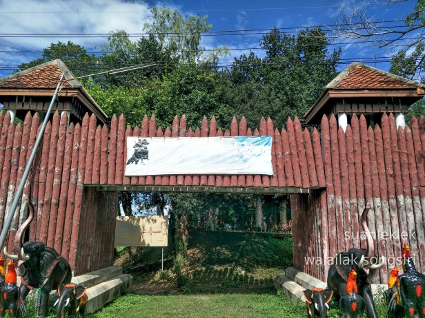 แนวกำแพงด้านใต้ส่วนทางทิศตะวันออกเคยมีผู้นำป้ายไปปักไว้ว่าเป็น “แนวค่ายพม่า” เมื่อนานมาแล้วก่อนที่จะขยายถนนเป็น ๔ ช่องทาง ต่อมาน่าจะมีการเชื่อถือกันมากขึ้นว่า แนวกำแพงดินนี้คือกำแพงค่ายพม่าจริงๆ จึงมีงบประมาณจากรัฐและผู้ศรัทธาสมเด็จพระนเรศวรมหาราชตามสมัยนิยมร่วมกันสร้างศาลและประตูค่ายประดิษฐ์ให้ดูเสมือนเป็นค่ายโบราณทำจากไม้ปรับปรุงให้กลายเป็นสถานที่สาธารณะ สามารถมาพักผ่อนหย่อนใจได้ เมื่อมองเข้ามาด้านหน้าจะเป็นลักษณะของกำแพงค่ายสีแดงอิฐ มีธงปักอยู่ด้านบนพลิ้วไสว ที่นิยมสร้างกันที่อำเภอบางระจันหรืออาจจะเห็นตัวอย่างจากสื่อ เช่น ละครโทรทัศน์หรือภาพยนตร์ และศาลาโปร่งที่มีรูปปั้นสมเด็จพระนเรศวรมหาราชทรงยืนถือดาบและพระพุทธรูปองค์หนึ่งให้สักการะ ชาวบ้านจากที่ต่างๆ แวะเวียนเข้ามาถวายน้ำแดงและรูปปั้นไก่เป็นจำนวนมาก แต่ทั้งนี้ผู้คนส่วนใหญ่จะเห็นเพียงคันดินใหญ่ส่วนนี้เท่านั้น ไม่ได้เห็นภาพของแนวกำแพงดินทุกส่วนที่มีอยู่ แม้ต่อมาจะมีการนำภาพผังแนวกำแพงเดิมมาขึ้นป้ายก่อนทางขึ้นศาลที่สร้างไว้สักการะรูปปั้นสมเด็จพระนเรศวรฯ ก็ตาม