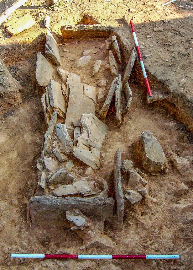 ผู้ศึกษาการขุดค้นและวิเคราะห์หลักฐานทางโบราณคดี เสนอข้อมูลจากการขุดค้นและศึกษาว่า ได้พบการนำเอาแผ่นหิน [Slab] มาใช้เรียงเป็นแนวยาวนี้ เป็นหินหลายประเภทนำมาจากที่อื่น เช่นหินเชล (shale) หินแกรนิต (granite) หินชนวน (slate) เป็นต้น พบการเรียงแผ่นหินต่อกันเป็นรูปกล่องสี่เหลี่ยมผืนผ้ามีพื้นด้านล่างและด้านบนมีแผ่นหินคลุมเป็นชิ้นๆ เช่นกัน แนวหินตั้งเป็นรูปสี่เหลี่ยมผืนผ้าและมีการตั้งแผ่นหินเป็นกลุ่มคล้ายกับการตั้งหินในการพิธีกรรมซึ่งคาดว่าน่าจะมีอายุอยู่ร่วมสมัย ส่วนแผ่นหินรูปกล่องมักวางกันเป็นคู่ใกล้ๆ กันขนาดประมาณ ๑๙๐-๒๔๐ เซนติเมตรในด้านยาว และ ๔๖-๘๔ เซนติเมตรในด้านกว้าง การขุดตรวจภายในพบภาชนะดินเผาและกำไลหินในสภาพที่ค่อนข้างชำรุด ไม่พบโบราณวัตถุที่ทำจากโลหะ แต่พบว่ามีลูกปัดหินควอทซ์ ขวานหินขัดร่วมอยู่ด้วย และไม่พบโครงกระดูกที่บ่งบอกว่าสร้างขึ้นเนื่องในพิธีกรรมการฝังศพแต่อย่างใด เมื่อนำตัวอย่างวัตถุไปกำหนดค่าอายุอยู่ที่ประมาณ ๒,๕๐๐-๒,๓๐๐ ปีมาแล้ว ซึ่งจากค่าอายุที่ได้นี้อยู่ในช่วงเวลาใกล้เคียงกับการมีอยู่ของชุมชนที่บ้านวังหาดซึ่งผลิตโลหะจากสินแร่เหล็กและเครื่องมือเหล็กต่างๆ หลากชนิดในยุคเหล็กตอนปลาย ทั้งยังพบโบราณวัตถุที่นำเจ้ามาจากแดนไกลทั้งภายในภูมิภาคและข้ามภูมิภาคเอเชียตะวันออกเฉียงใต้ แม้จะอยู่ในระยะไม่ไกลกันเกิน ๓๐ กิโลเมตร ดูจะมีรูปแบบการดำเนินชีวิตวัฒนธรรม รวมถึงการติดต่อกับกลุ่มคนภายนอกที่แตกต่างกันมาก