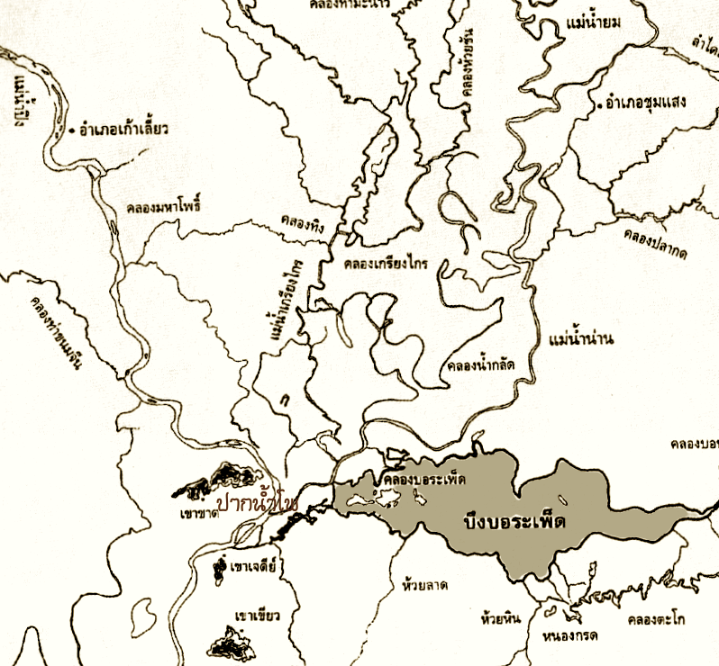 วันที่ ๑ พฤศจิกายน เวลาเช้า ๑ โมงเศษ ลงเรือประทีปทัศนาการขึ้นไปจนถึงปากคลองบอระเพ็ดในลำน้ำแควใหญ่ ถ่ายลงเรือกลไฟเล็กเพราะคลองนั้นถึงว่าน้ำลึกถึง ๓ วา ก็คดมากเข้าไปไกลอยู่จนถึงบึงๆนี้ใหญ่มาก และเป็นทางที่จะไปได้หลายทางไม่มีกรุยก็หลง ถ้าจะถึงคลองบุษบงที่บางมูลนาคก็ไปได้ เวลาหน้าแล้งเป็นลำน้ำตลิ่งสูงเรือเดินเข้าออกตลอดปี มีคนอยู่ในนั้นมาก แต่เพราะเวลาหน้าน้ำๆท่วมเหลือเเกินนักจึงไม่ได้ปลูกเรือนปักเสาได้เลยอยู่แพทั้งสิ้น และท่าจะจอดแพอยู่ในที่ว่างๆก็ไม่ได้ ต้องเข้าแอบอยู่ตามพุ่มไม้ด้วยพายุจัด ต่อถึงฤดูแล้งจึงจะลงจอดอยู่ในลำคลอง มีแต่วัดๆเดียวซึ่งได้ใช้ปักเสากุฎี และบึงนี่เรียกชื่อว่าบึงบอระเพ็ดนั้น เฉพาะตัดลำคลองเข้าไปหน่อยหนึ่งเท่านั้น ต่อเข้าไปข้างในก็มีชื่อเป็นตำบลต่างๆ คนที่อยู่ในนั้นก็ทำปลาทั้งสิ้น นับว่าเป็นที่แห่งหนึ่งซึ่งสนุกและงาม ข้างเมืองเหนือนี้ เขาผูกแพเล็กๆไว้สำหรับให้หยุดพักเป็นที่เลี้ยงกรมการและพวกพ่อค้าลงเรือมาเลี้ยงและได้แจกเสมาในที่นั้นด้วย”
