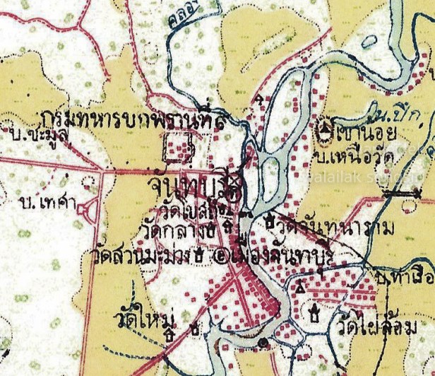 แผนที่จากกรมแผนที่ทหารสำรวจเมื่อ พ.ศ. ๒๔๕๕ แสดงตำแหน่งป้อมในเมืองจันทบูรอย่างชัดเจน ขณะนั้นใช้เป็นกรมทหารพรานบกที่ ๙