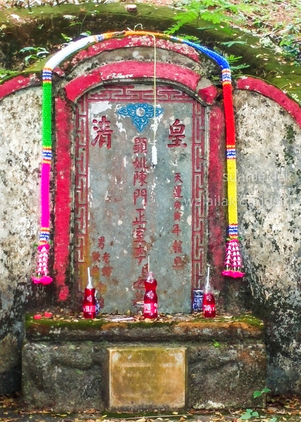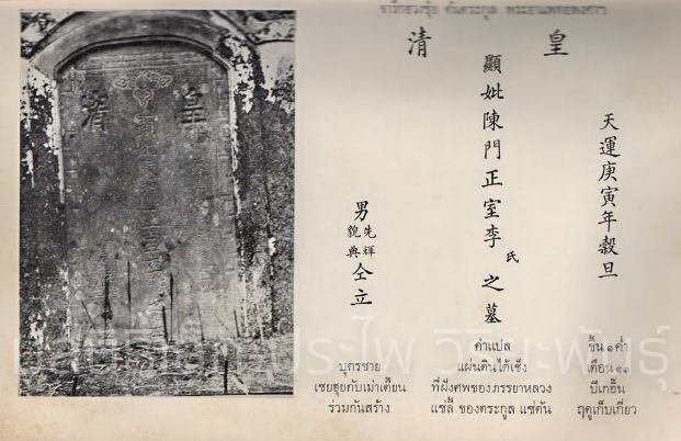บุตรชายสองท่านนาม “เซยฮุยกับเม่าเตี้ยน” ร่วมกันสร้างที่ฝังศพของภรรยาหลวงของบิดาที่แซ่ลี้ ในตระกูลแซ่ตัน ขึ้น ๑ ค่ำ เดือน ๑๑ ปีเกอิ้น ฤดูเก็บเกี่ยว (ที่คุณ นพพร ภาสพงษ์แปลว่าเป็นปี พ.ศ.๒๓๑๓ ) ตรงกับแผ่นดินสมเด็จพระเจ้ากรุงธนบุรี