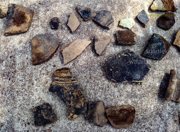 เศษภาชนะดินเผาแบบไหเคลือบแบบจีนและเซลาดอนเขียว จากบริเวณวัดแก้วที่ถูกรื้อและเป็นอาคารเรือนยาวในค่ายตากสิน