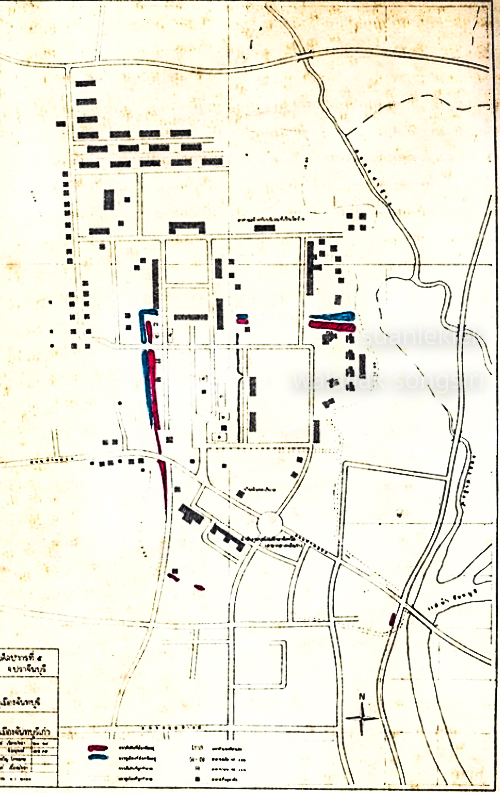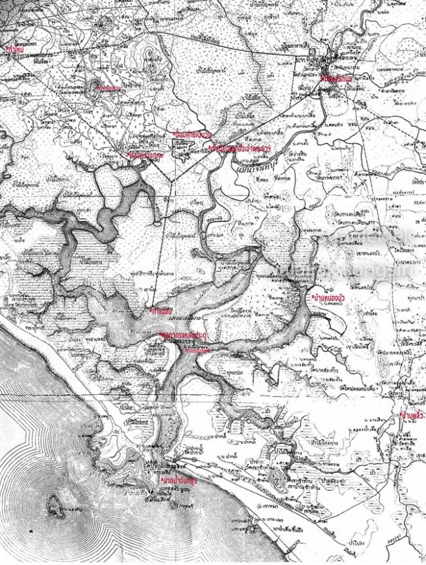 แผนที่แสดงตำแหน่งสันนิษฐานอู่ต่อเรือสยามที่ท่าแฉลบและสถานที่ต่างๆ จากบันทึกของหมอบรัดเลย์ซึ่งเดินทางเมื่อ พ.ศ. ๒๓๗๘ , กรมแผนที่ทหาร มาตราส่วน ๑ : ๕๐,๐๐๐ พิมพ์เมื่อ พ.ศ. ๒๔๕๕ เห็นแนวขอบเขตของเมืองป้อมที่เนินวงอย่างชัดเจน