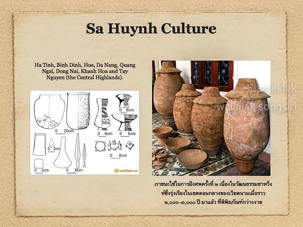 อันเป็นวัฒนธรรมที่มีประเพณีการฝังภาชนะใส่กระดูก ข้อมูลที่ได้จากเมืองฮอยอันซึ่งอยู่ในเวียดนามตอนกลาง และโฮจิมินซิตี้ซึ่งอยู่ทางตอนใต้ พบการฝังภาชนะใส่กระดูกขนาดสูงใหญ่ทรงกระบอกก้นกลมและมีฝาปิด ในพื้นที่ซึ่งเป็นเนินทราย [Sand dune] ใกล้ชายฝั่งทะเล มีการขุดค้นที่แหล่งโบราณคดีหัวซาและอันบาง [Hua Za , An Bang] ซึ่งอยู่ใกล้กับเมืองฮอยอัน แต่ไม่พบกระดูกมนุษย์ในภาชนะเหล่านี้ แต่พบภาชนะขนาดเล็ก เช่น หม้อที่มีลายขูดขีดเคลือบสีแดง เครื่องมือเหล็ก เช่น มีด ขวาน ลูกปัดแก้ว ลูกปัดหินคาร์นีเลียน พบอยู่ภายในและรอบๆ ไห ลูกปัดทองคำและต่างหูแบบเขาสองหน้า [Bicefalous pendant] อันเป็นเครื่องประดับชิ้นเด่นในวัฒนธรรมซาหวิ่งห์